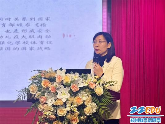 主题报告环节,登封市教师发展中心慎淑霞、郑州市金水区教育发展研究中心冯静、郑州市中原区教学研究室阎莉、郑州市郑东新区基础教育教学研究室陈静等四位教研员分别围绕“运动负荷”“动作发展”“自我保护”“体育品德”等主题展开分享交流。