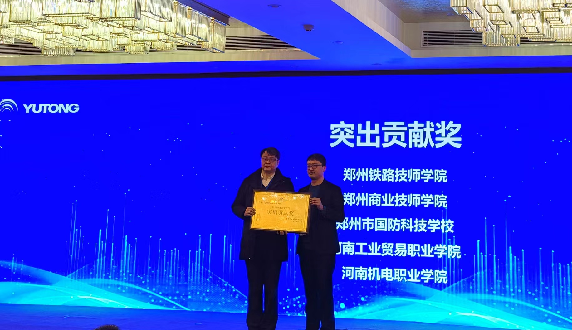 2024年1月11日,宇通集团2023年度校企合作年会暨年度表彰大会在企业会场举行,在本次盛会中,郑州市国防科技学校以其卓越的表现和突出的贡献,获得了宇通集团颁发的突出贡献奖。