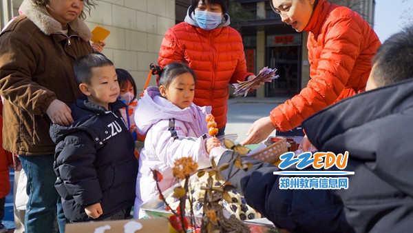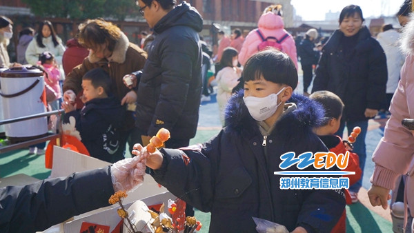 甜甜的糖葫芦、漂亮的花馍馍,更引得宝贝们垂涎欲滴。当快乐的游戏告一段落,集齐“五福”,孩子们就可以领到一份“甜蜜礼物”,在品尝美食中尽情回味这快乐的游戏时光。欢乐的庙会活动为一学期的美好时光画上了一个完美的句号,带着欢笑、带着不舍,孩子们即将迎来轻松的寒假生活!