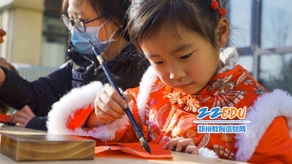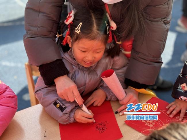 在“龙行龘龘之艺术巧手龙”主题游戏场地里,孩子们剪窗花、印年画、写福字、画大龙,感受着中国传统文化的艺术魅力,一幅幅艺术作品充满着稚嫩的童趣,又彰显着孩子们不断发展着的动手能力和属于自己的艺术创造力。家长志愿者们则在游戏现场为孩子们书写对联,引得小朋友们纷纷围观。看着爸爸妈妈、爷爷奶奶们用毛笔在红纸上写出漂亮对联,孩子们也忍不住要试一试,他们也拿起小毛笔,认真地写着、画着,中华优秀传统文化正在潜移默化中传承着、积淀着。