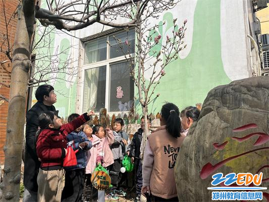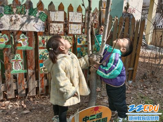 登封市嵩阳实验幼儿园老师带领孩子认识校园的各种树木