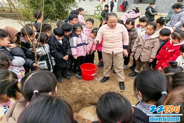 登封市东华镇中心小学教师为学生讲解种树苗的注意事项