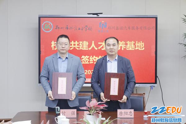随后,在校企双方的见证下,郑州市科技工业学校党委书记付强与郑州鑫诺汽车服务有限公司总经理唐阳忠签署了《校企共建公共实训基地协议书》并为基地揭牌。