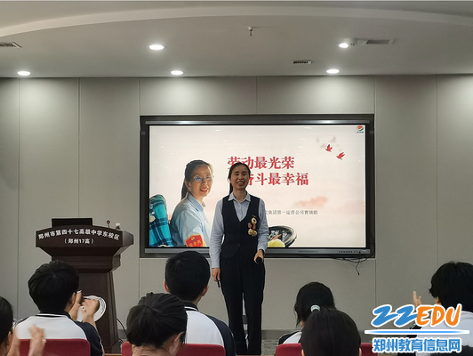 2025年4月28日上午,为弘扬劳模精神、工匠精神,引导青少年树立正确的劳动价值观,郑州市第十七高级中学特邀全国劳动模范、郑州市公共交通集团有限公司第一运营公司曹瑞娟到校开展“劳动最光荣,奋斗最幸福”主题团课。活动由学校徳学中心副主任赵冰冰主持,高一、高二和高三年级入团积极分子参与,活动现场掌声不断,反响热烈。