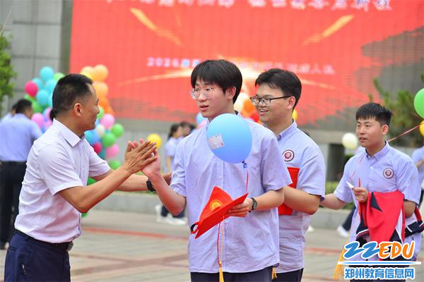 学校领导为走过“成人门”“成才门”“成功门”的同学击掌加油