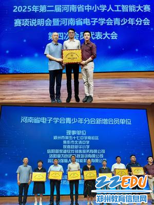 随后举行授牌仪式,郑州市第五十七中学南校区获得“河南省中小学人工智能大赛示范校”和“河南省电子学会青少年分会理事单位”双授牌。由河南省电子学会秘书长官兵、河南省电子学会青少年分会秘书长邹伟共同颁发,标志着学校在人工智能教育领域已形成示范引领效应,正式成为我省青少年科技教育的重要支点。