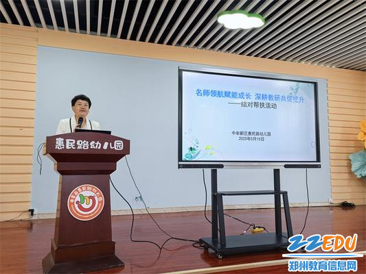 活动伊始,中牟新区惠民路幼儿园园长周金枝致欢迎词,代表全体教职工及周边姊妹园所的老师们对帮扶团队的到来表示热烈欢迎并介绍了幼儿园基本发展情况。