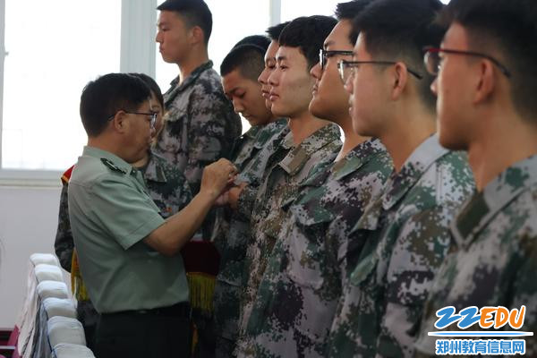 郑州市国防科技学校副校长段峰为新团员佩戴团徽徽章