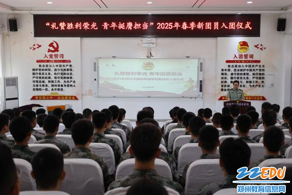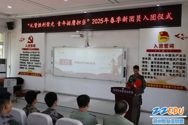 2025年6月11日上午,郑州市国防科技学校团校教室内团旗高悬、誓言铿锵,“礼赞胜利荣光 青年挺膺担当”新团员入团仪式庄严举行。学校党委书记张凯,学校党委副书记、校长段红军,副校长段峰出席活动,100名经严格选拔的新团员共同宣誓加入中国共产主义青年团。