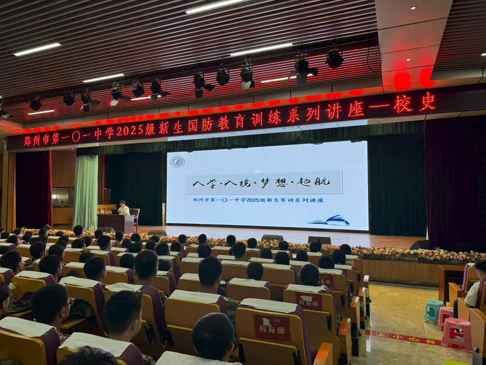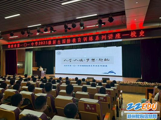 2025年8月15日是日本宣布无条件投降80周年纪念日,为深化国防教育,厚植爱国情怀,引导学子在历史传承中筑牢信仰之基,郑州市第一〇一中学举办了特色国防教育活动。“出彩河南人”2021最美教师获得者、郑州市第一〇一中学教师朱奎鹏在学校图书馆三楼报告厅,为全体参训学生带来一场主题为《认清明天的去向,不忘昨日的来处》的校史讲座,通过回溯学校与家国同频共振的发展历程,将红色基因融入国防教育,激励学子在历史传承中厚植爱国情怀。