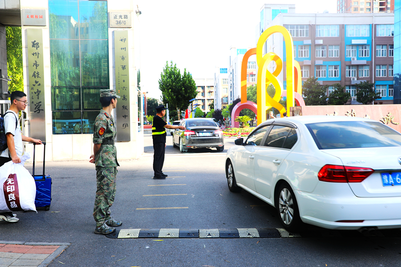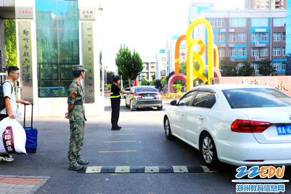 教官、保安在学校门口指挥新生及家长入校路线。