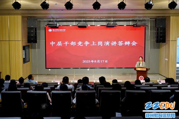 为进一步夯实干部队伍建设,提升学校治理水平,持续推动教育高质量发展,8月17日,郑州市第五高级中学2025年中层干部竞争上岗演讲答辩会在学校学术报告厅召开。