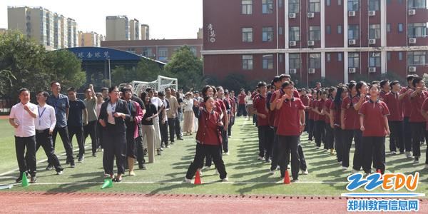 周铁刚老师带领师生做热身运动,活力互动中传递“健康第一”理念