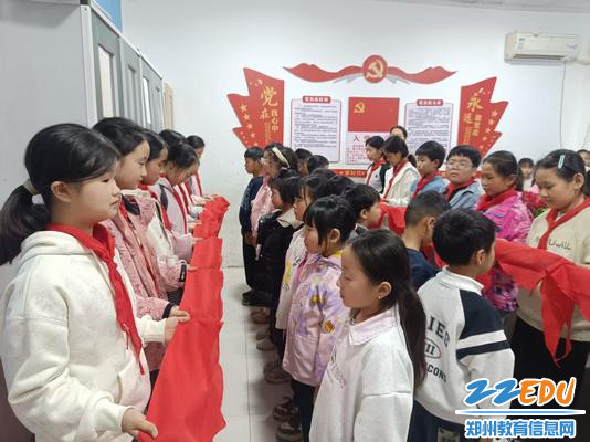 郑州航空港区韩佐小学老队员为新队员佩戴红领巾