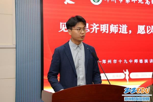 演讲比赛由学校袁振华老师主持。学校党委副书记、校长张浩,学校副校长王帆、王勇,郑州市陇海中学执行校长罗斐及部分中层干部出席活动。学校团委副书记孙梦凯在开场致辞中强调师德是教师职业行为的准则与情操的体现,是教育工作的灵魂所在,勉励参赛教师们尽情释放教育热情和师德力量,彰显教师风采和担当。