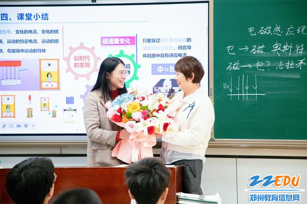 郑州11中校长张莹代表学校向杨静老师送上鲜花