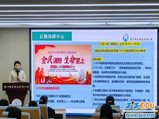 郑州师范学院附属小学副校长王燕玲在全体教职工会上进行演练方案解读