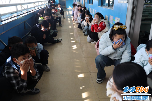 各班学生弯腰捂鼻有序撤离