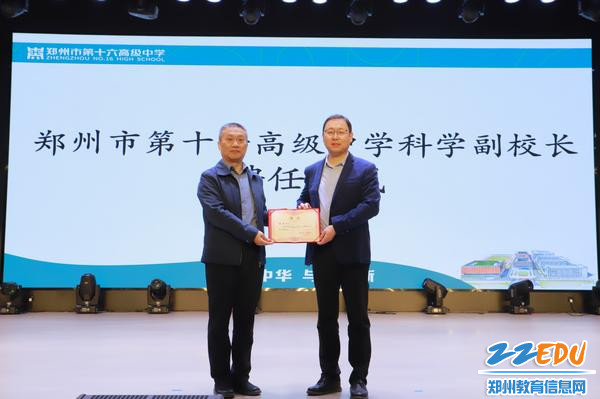 郑州市第十六高级中学党委书记朱红军为华北水利水电大学机械学院副院长李刚教授颁发聘书