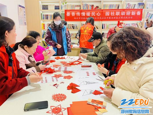 活动现场暖意融融、笑语盈盈,墨香与剪纸的雅致气息交织弥漫。郑州市实验幼儿园志愿者们提前备好红纸、笔墨、剪刀等物料,与社区工作者、居民代表围坐一堂,共话新春。