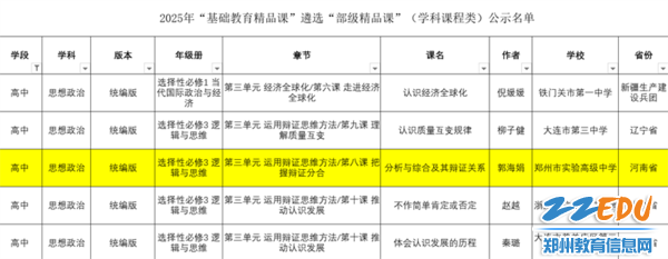 学期末收官、新春将至,2026年2月5日,郑州市实验高级中学教育战线再传捷报。在教育部组织的2025年“基础教育精品课”遴选活动中,郑州市实验高级中学政治组教师郭海娟执教的课例《分析与综合及其辩证关系》凭借其创新的教学设计与卓越的育人实效,历经层层选拔与专家严格评审,成功获评“部级精品课”。