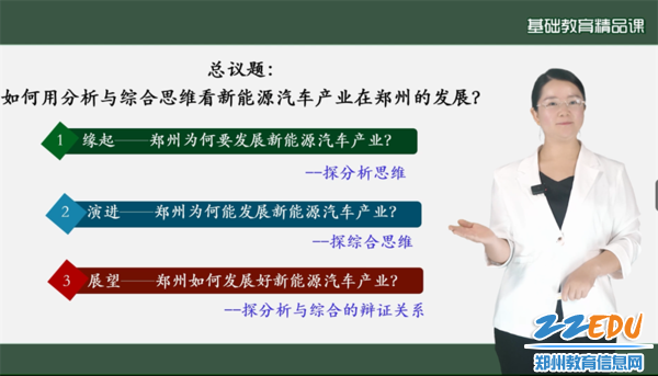 据了解,郭海娟的获奖课例,选自普通高中思想政治选择性必修三《逻辑与思维》。课程围绕“分析与综合及其辩证关系”这一核心内容展开,针对其理论比较抽象、学生理解难度大等难点,郭老师及政治组教师进行了深入探索。教学设计以学科核心素养培育为导向,创造性地选取“新能源汽车产业在郑州的发展”这一本土化、时代性强的真实情境作为主线,构建了清晰的“缘起、演进、展望”教学脉络。通过将抽象的思维方法与生动的社会现实深度融合,并灵活运用小组合作、情境探究、成果展示等多元化教学方式,有效激发了学生的思维灵活性与学习主动性,实现了知识传授、能力提升与价值引领的有机统一。