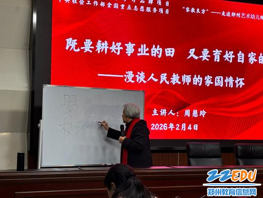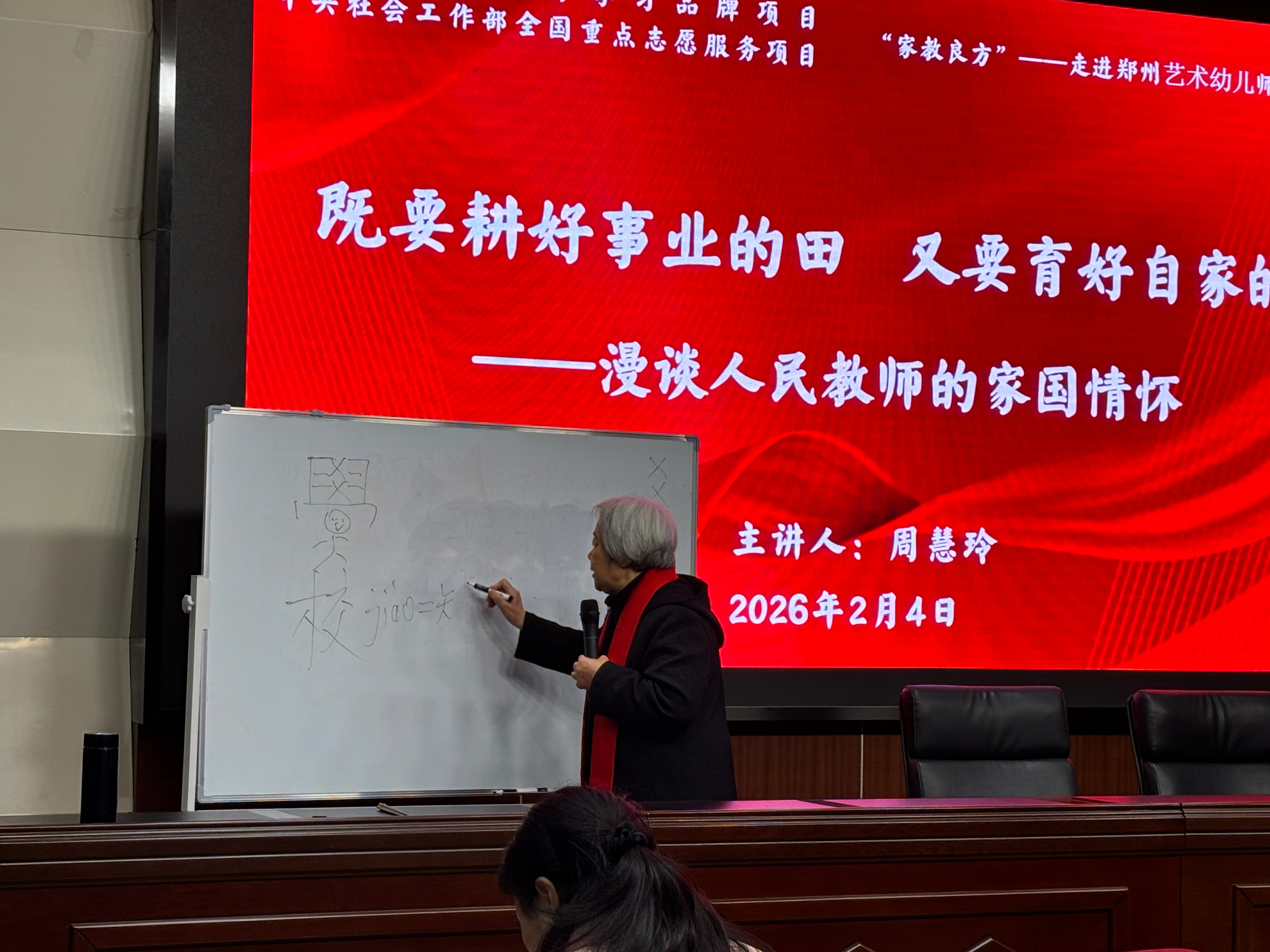 会上,学校特邀“五栖”资深教育人、全国离退休干部先进个人、全国“最美五老”、文化行者周慧玲作专题报告。她以《漫谈人民教师的家国情怀》为题,以“心中有仁,立德树人”为核心,详解孩子品德培养与社会责任感塑造路径。培训中,周慧玲以自身创办的网上公益终身学习平台“家教良方”为引,强调教师将社会主义核心价值观融入日常教学,为参会教师带来深刻育人启发。