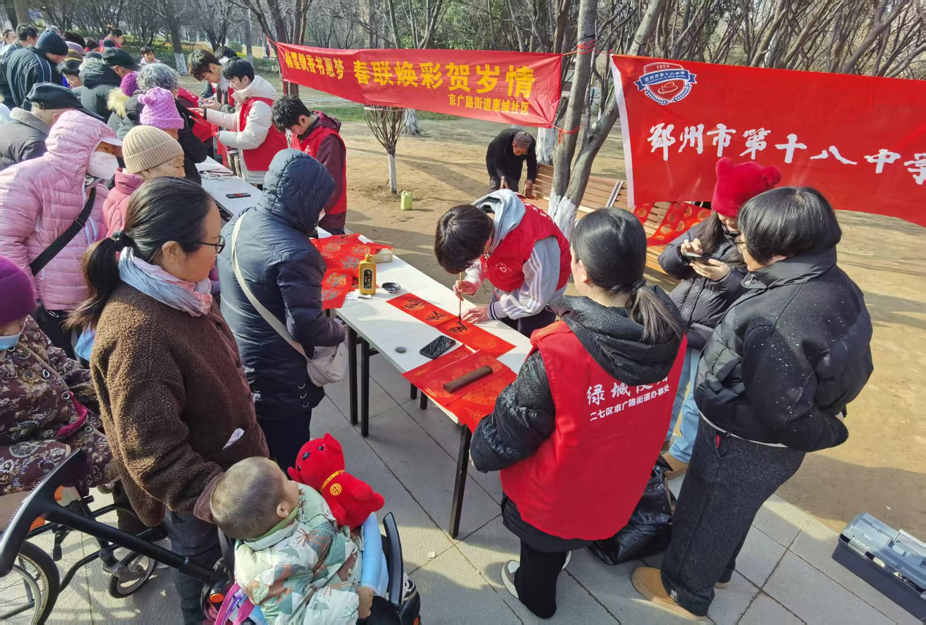 为加强文明校园与新时代文明实践站结对共建工作,弘扬“向善”校园文化,奉献爱心,践行文明,2月9日上午,郑州市第十八中学10名书法专业学生,在书法专业教师赵玉亭、学校团委书记李晓带领下,到双秀公园开展写春联、送祝福活动。本次活动,是学校联合京广路街道惠城社区,共同开展的一次公益活动。