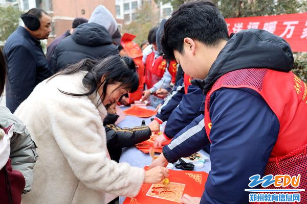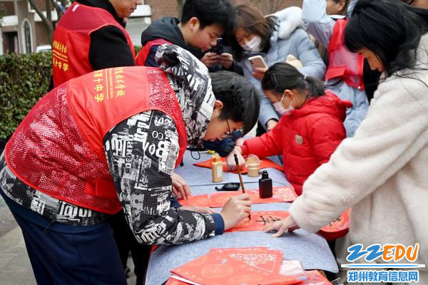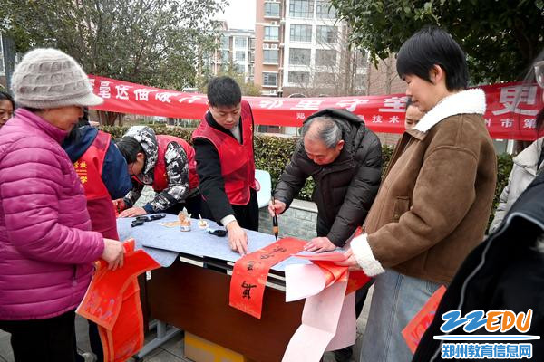 2月9日,郑州市信息技术学校(郑州市第十中学)组织二十余名师生志愿者来到郑东新区豫兴路办事处锦绣路社区宁馨苑小区,开展“挥毫送福暖万家 邻里守望情更浓”志愿服务活动。