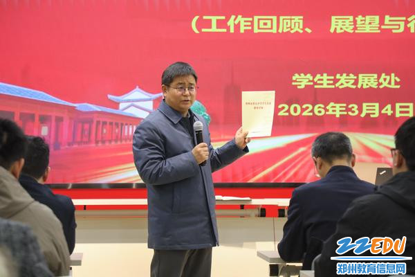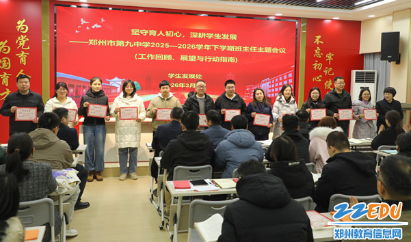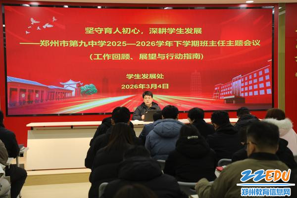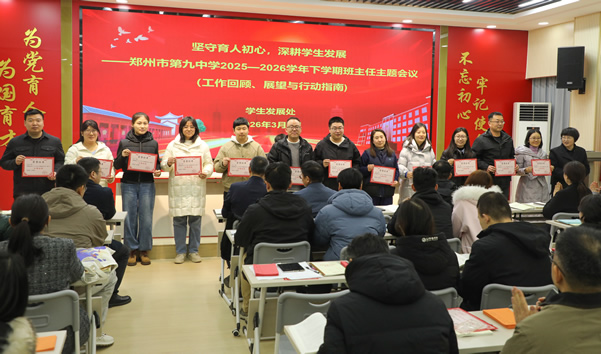 2026年3月4日上午,郑州九中执中楼会议室暖意融融、氛围浓厚,2025-2026学年下学期德育心育主题会议在此召开。学校党委书记周继莉等校级领导、全体班主任、学生发展处老师及青年教师齐聚一堂,以“坚守育人初心,深耕学生发展”为核心,共商班级管理良策,共谋学校德育新篇。