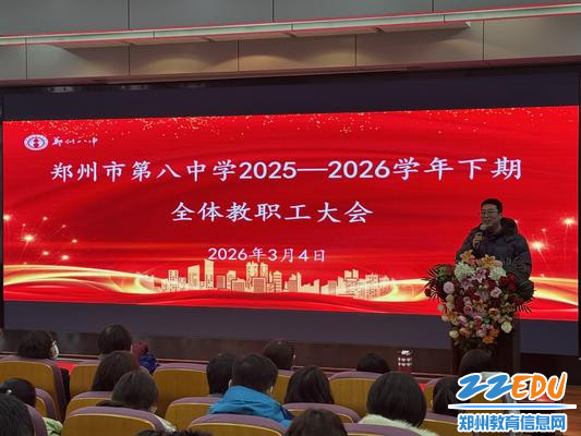 春光为序,华章再启。3月4日上午,郑州市第八中学在学校报告厅召开新学期全体教职工大会。郑州市第八中学本部及新校区全体教职工齐聚一堂,以饱满的热情共绘新学期发展蓝图。会议由郑州市第八中学办公室主任杨建勇主持。