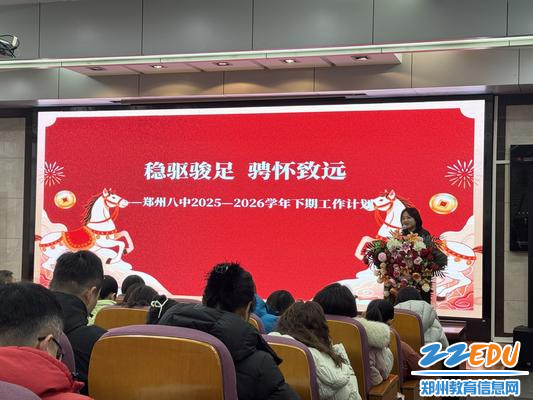 雷炀以《稳驱骏足 骋怀致远》为主题,系统阐述了校本部新学期的重点工作。她讲到,学校本部将继续深耕“根文化”教育沃土,以党建引领赋能,稳中求进开新局;德育综合施策,稳中增效育新人;教育立体推进,稳中提质赴新程;行政服务精良,稳中创优续新章。