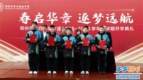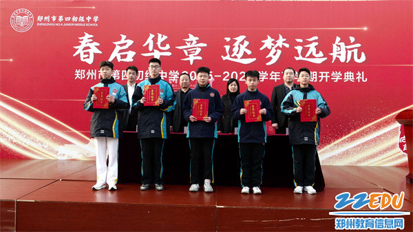 郑州市第四初级中学副校长王伟宣读上学期先进集体名单,学校领导为获奖班级颁发荣誉证书。
