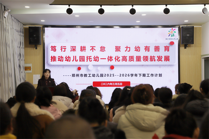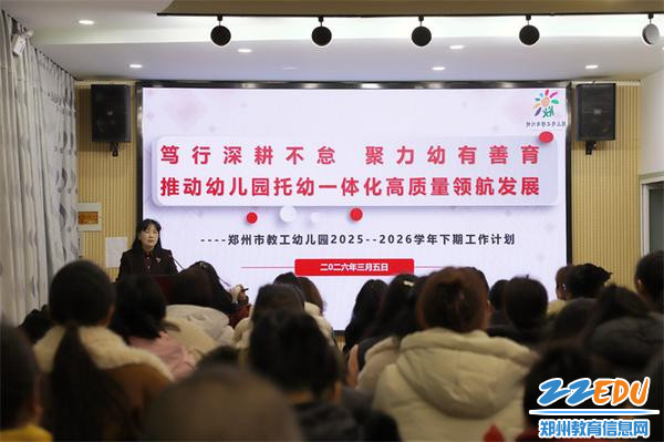 为全面统筹新学期各项工作,压实工作责任、明晰发展方向,全力保障春季开学平稳有序推进,2026年3月5日上午,郑州市教工幼儿园召开2025—2026学年下期全体教职工大会。全体教职工以昂扬饱满的精神状态、焕然一新的工作面貌齐聚多功能厅,共话新学期发展,共谱幼教新篇章,郑州市教工幼儿园党支部书记、园长陈春主持本次会议并作重点工作部署。