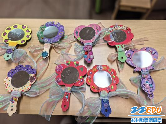 “以我小手,映你容颜,照见妈妈,框住温暖!”装饰小镜子制作现场更是精彩纷呈,原本光秃秃的小镜子,在孩子们的巧思与巧手下渐渐焕发生机、华丽变身。孩子们用柔软的纸粘土,捏造出娇艳的花朵、饱满的爱心、灵动的波浪等各样造型,细心地点缀在镜子边缘;再将彩色小珠子、闪亮亮片、精美卡纸等材料一一粘贴,最后拿起水彩笔勾勒出精致的花边,每一处设计都独具匠心。星空款、花园款、爱心款……一面面专属小镜子精致可爱,每一道纹路、每一颗装饰,都承载着孩子们对妈妈满满的祝福。
