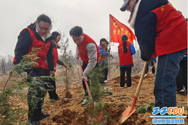 活动现场,在“党建红引领生态绿”的鲜明旗帜下,师生们分工协作、干劲十足。大家手持铁锹、水桶等工具,从挥锹挖坑、扶苗填土到踩实浇水,每一道工序都细致严谨、有条不紊。“商贸红”志愿服务队的旗帜在植树现场迎风飘扬,党员教师率先垂范,青年学生积极跟进,在劳动中践行初心使命,在协作中凝聚青春力量,充分展现了师生昂扬向上的精神风貌与责任担当。一棵棵松柏树苗扎根沃土,为春日的郑州披上了一抹鲜亮的绿色,也将“绿水青山就是金山银山”的理念深深根植于师生心中。