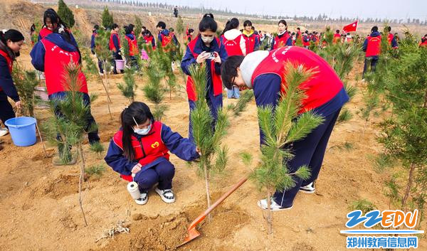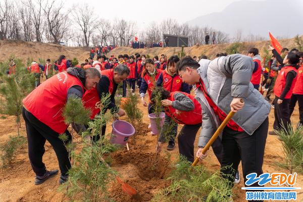 本次活动以“青春增绿中原 共建美丽郑州”为主题,由共青团郑州市委、郑州市林业局等单位联合主办,旨在引导广大青少年树立生态文明理念,为黄河流域生态保护和高质量发展贡献青春力量。下午两点半,学校师生准时在植树基地集结,与全市各界青少年植树队伍汇合,在工作人员的统一指引下,迅速投入到植树劳动中。
