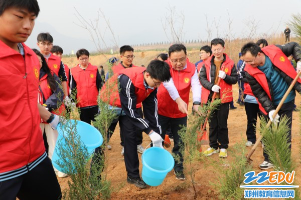 郑州市第三十一高级中学党总支书记曾涛(前排中)带领师生种植树苗