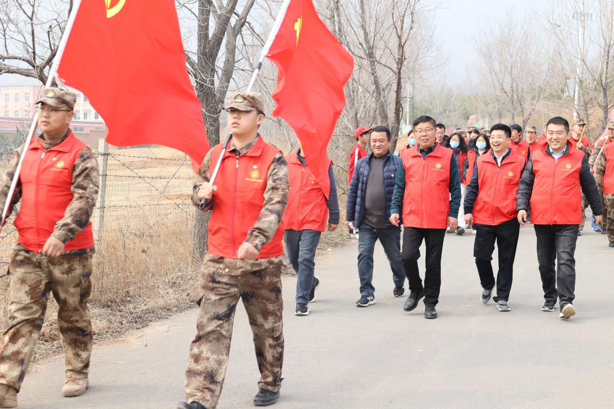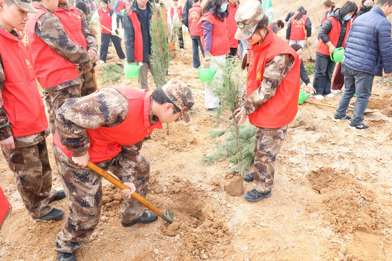 活动现场,师生们身着统一服装,精神抖擞、分工协作,充分发扬国防学子严谨细致、吃苦耐劳的优良作风。挖坑、扶苗、培土、踩实、浇水,每一道工序都有条不紊、一丝不苟。党员教师率先垂范,带头挥锹劳作;学生们热情高涨,相互配合、默契协作,同学们更是以军事化标准规范操作,展现出极强的团队凝聚力与执行力。大家干劲十足,汗水浸湿衣衫,却依旧笑容满面,亲手将一棵棵树苗栽入土中,让新绿在春日里扎根生长。