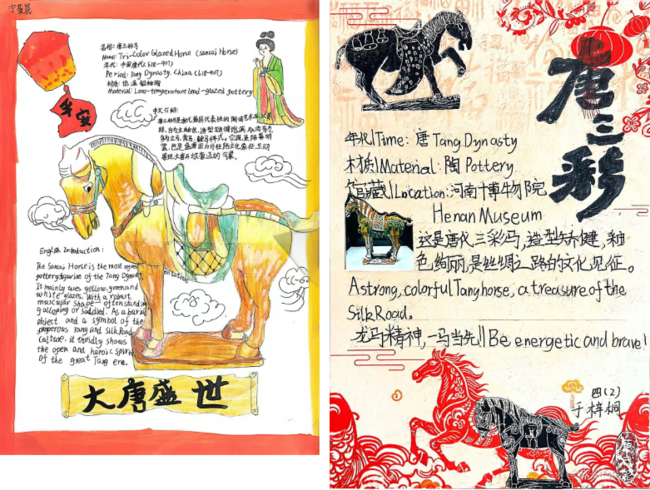 在“文物侦探”环节,学生们在河南博物院线上展厅寻找“马”主题文物,为唐代三彩马等珍贵文物制作专属名片,用文字描绘文物造型,挖掘背后的历史故事。