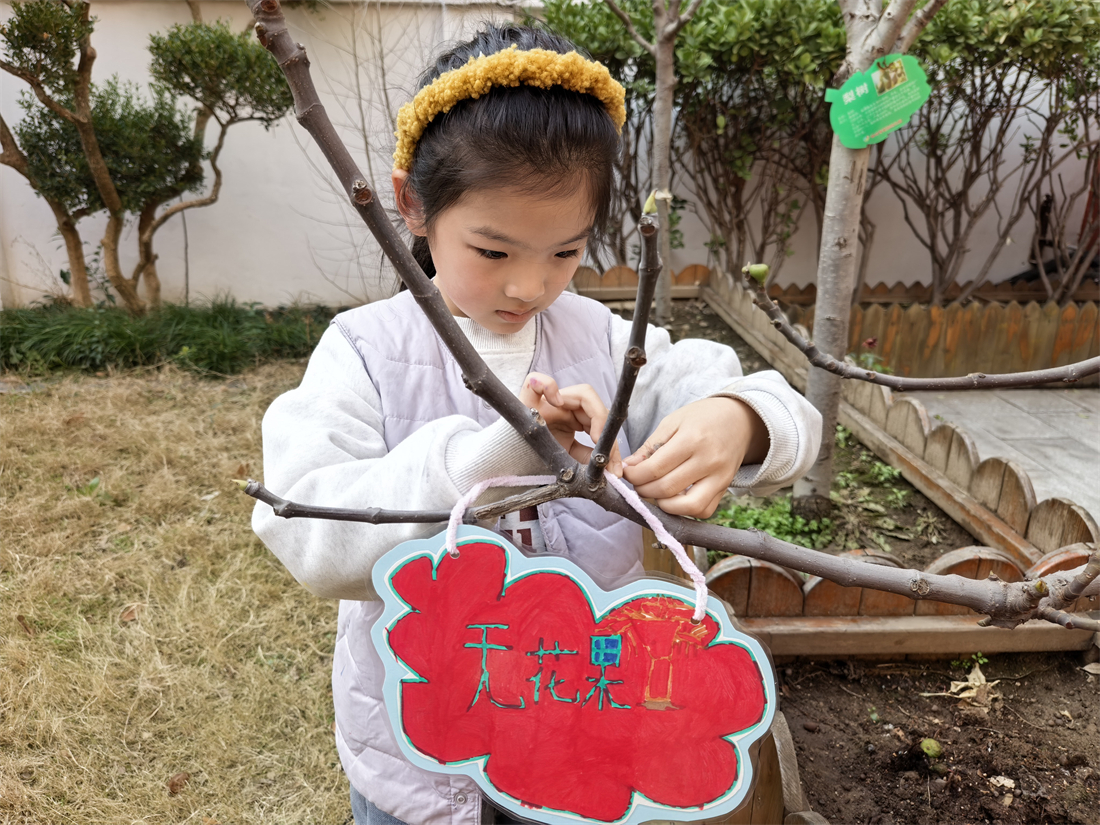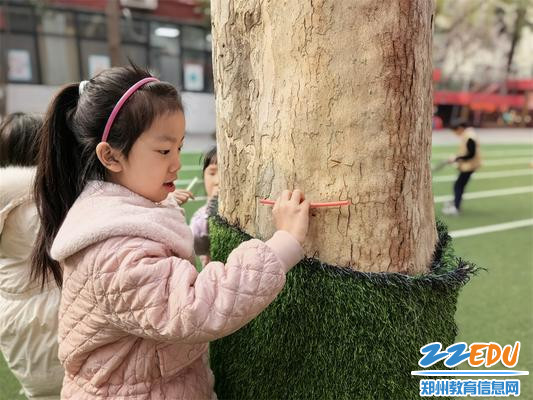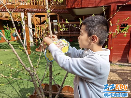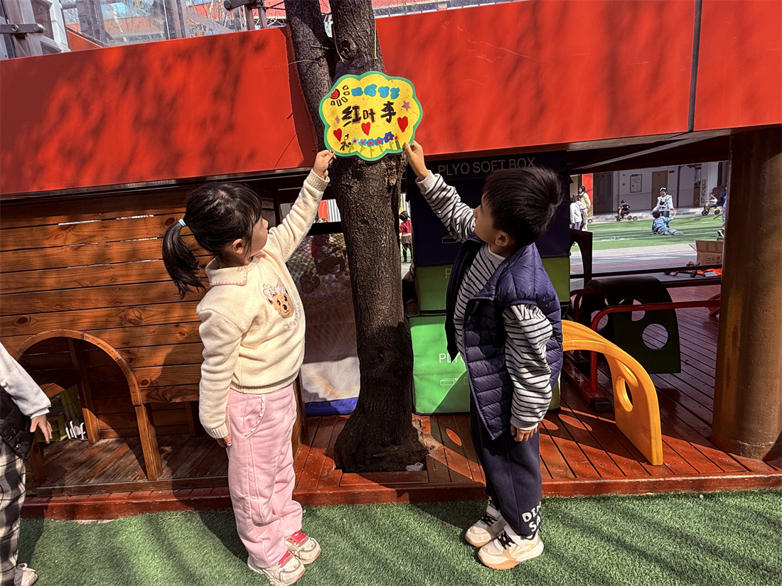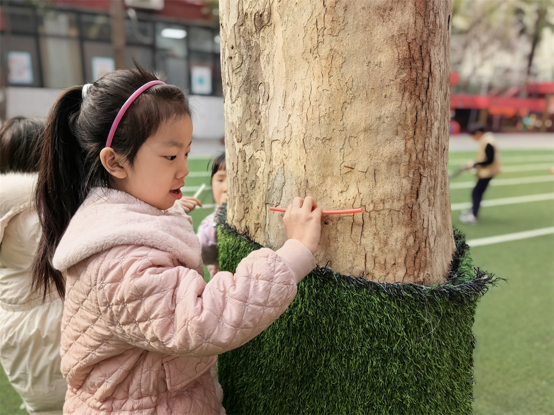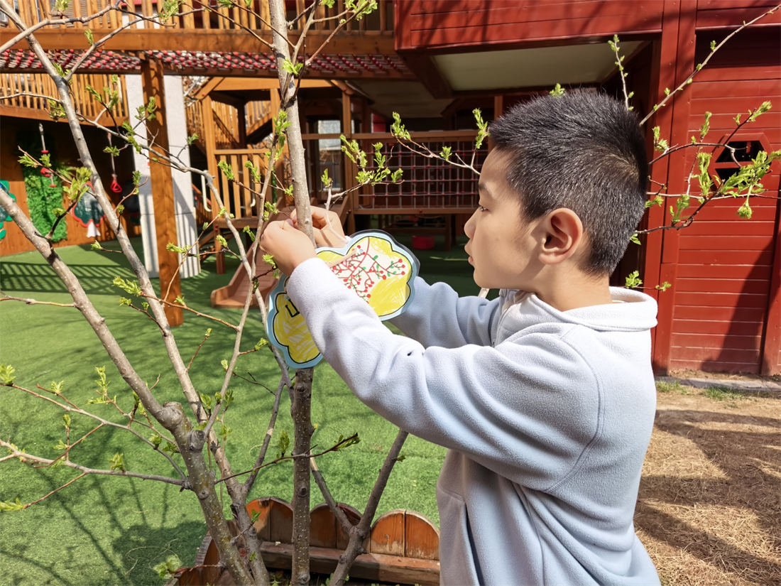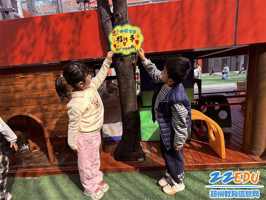 最让孩子们感到兴奋的,当属“我来给小树画姓名牌”环节。孩子们尽情发挥奇思妙想,为幼儿园里的小树精心设计专属姓名牌,有的在牌上画上可爱的笑脸,有的写下稚嫩又温暖的祝福,还有的为小树起了“绿芽儿”“柳依依”这样清新可爱的名字。当孩子们小心翼翼地将自己制作的精美姓名牌亲手挂在树枝上时,小脸上满是骄傲,眼神里藏着满满的自豪与期待,爱护植物、守护自然的种子,也在这一刻悄悄种进了孩子们的心中。