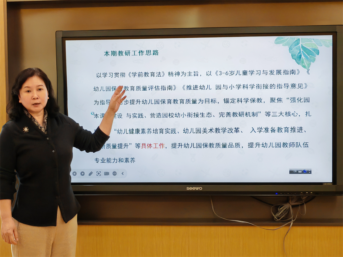 会议伊始,郑州市实验幼儿园副园长黄艳围绕新学期教研工作思路,以“强化园本课程建设与实践、营造园校幼小衔接生态、完善教研机制”为三大核心任务,对幼儿健康素养培育、幼儿园美术教学改革、入学准备教育推进等具体工作作出细致部署,为全体教师绘制了清晰的“教研路线图”,确保教研活动有计划、有深度、有实效。