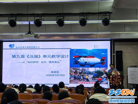会议最后,郑州市金水区教育教师发展中心教研员高凌浩以《第九章〈压强〉单元教学设计——从“知识罗列”走向“素养表达”》为题开启专题分享,通过马德堡半球实验动态演示、潜水艇工作原理剖析等鲜活案例,说明了物理教学需突破传统知识框架,引导学生从生活现象中建构科学思维。“真正的素养培育,在于让学生像科学家一样思考。”高凌浩掷地有声的观点引发全场共鸣。