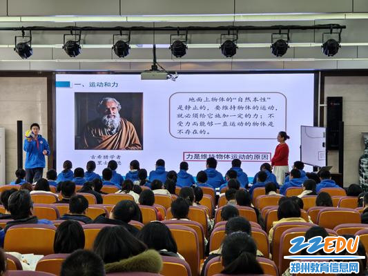 活动伊始,郑州市第八中学物理教师邓雯展示了《牛顿第一定律》的观摩课。邓雯运用AR技术重构物理教学场景,让“伽利略”“牛顿”亲临课堂,让与会的老师们眼前一亮。郑州市金水区教育教师发展中心教研员高凌浩说:“邓雯老师在本节课上,结合《考工记》与上海中心大厦等古今科技实例,培养学生辩证历史观与文化自信,并落实教学评一致性原则,实现科技与人文的深度融合。”