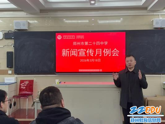 2026年3月18日下午,郑州市第二十四中学召开新闻宣传工作月例会,学校相关领导、教师参会。本次会议以专题培训为核心,旨在提升学校新闻宣传实操能力、推动宣传工作再上新台阶。