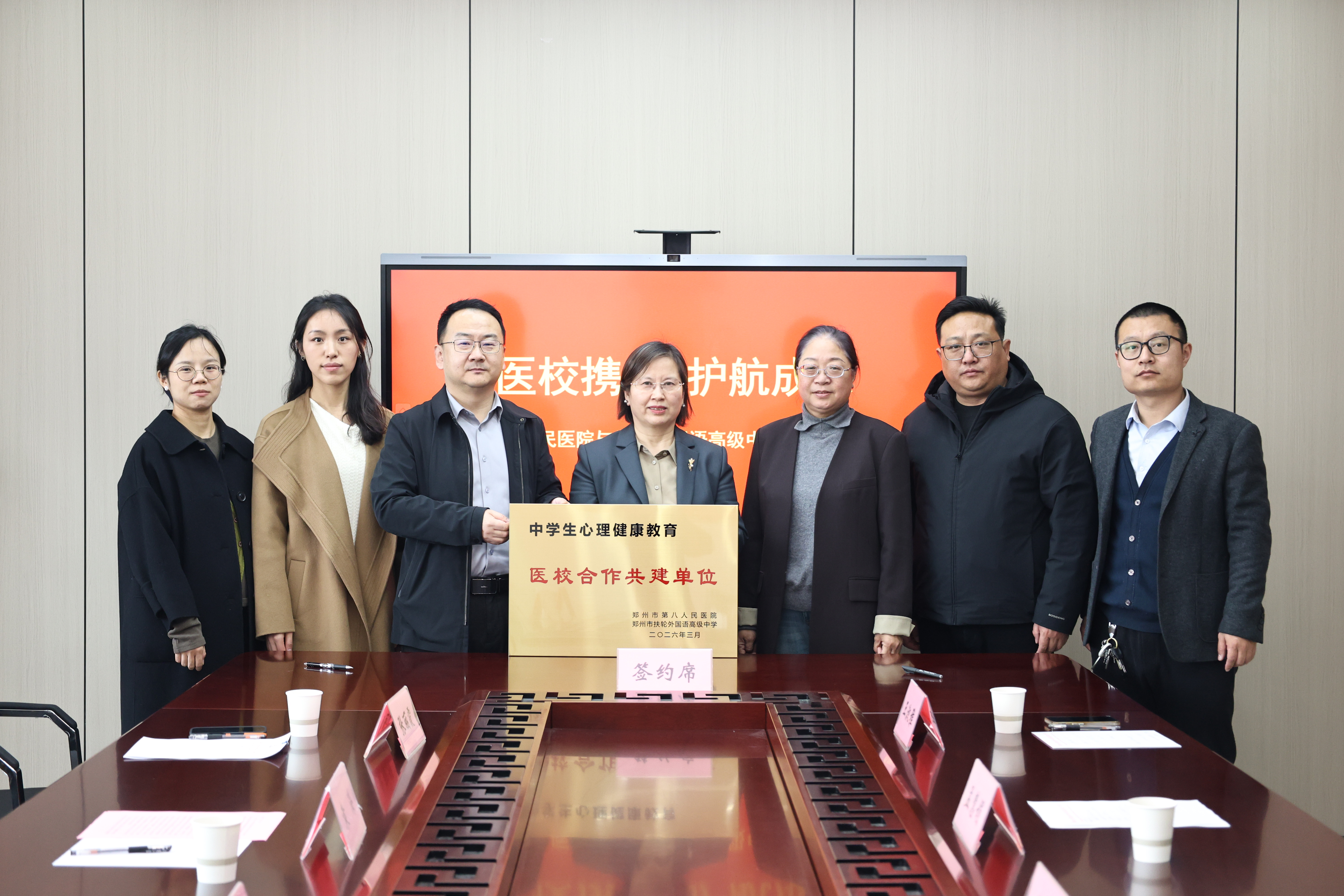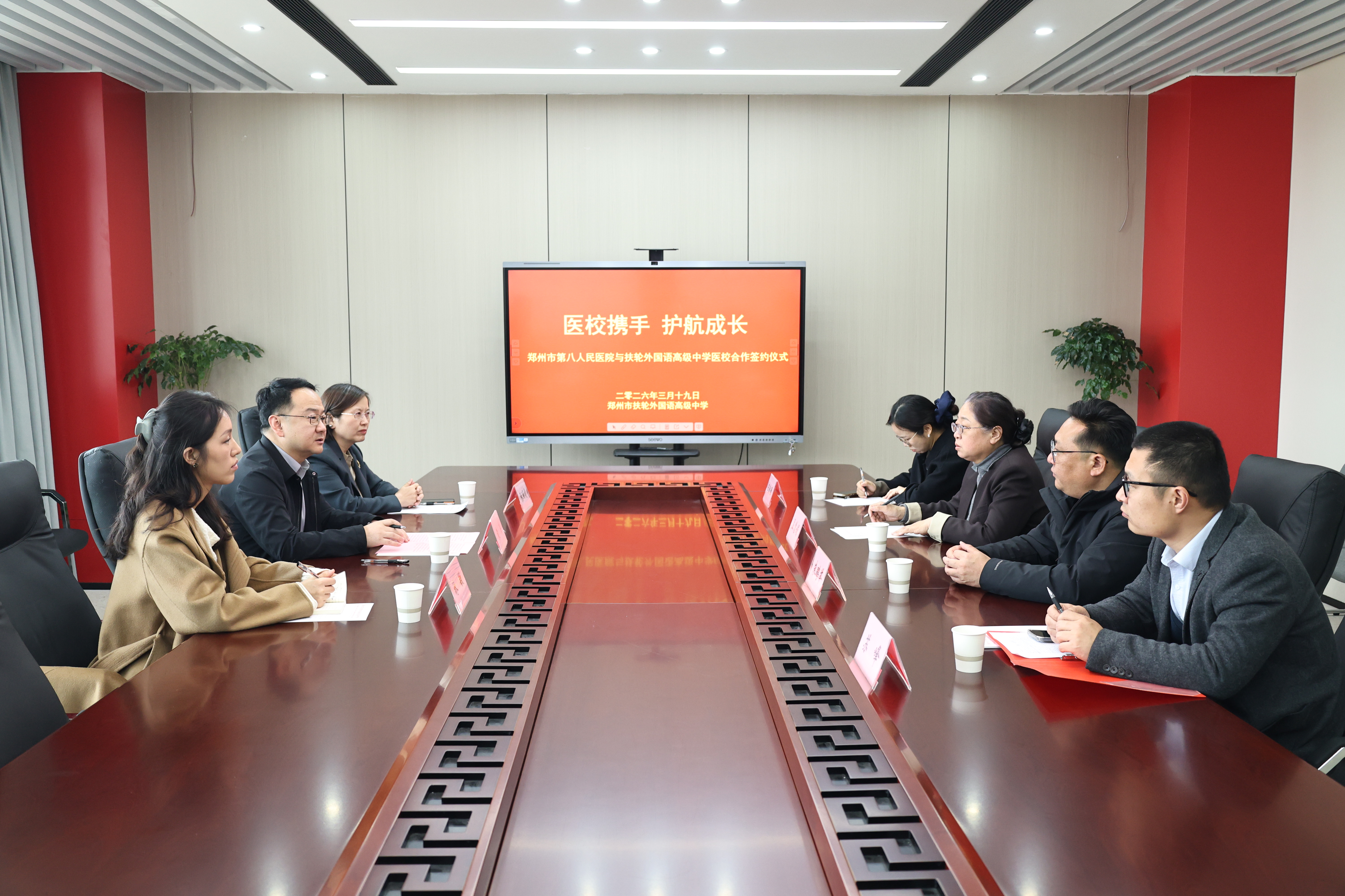 3月19日下午,郑州市扶轮外国语高级中学与郑州市第八人民医院“医校共建战略合作协议”签约仪式在该校会议室举行。此次合作旨在深入贯彻落实国家及省市关于加强中小学生心理健康教育工作的相关文件精神,进一步提升师生心理健康素养,构建医教协同、共育心灵的新格局。郑州市第八人民医院医务科科长袁海、健康管理中心主任张丽霞、心理治疗师林敏,郑州市扶轮外国语高级中学副校长孟慧娟、朱鹏举,学生发展中心副主任苏峰、学校心理教师王淑雅等双方代表出席签约仪式。