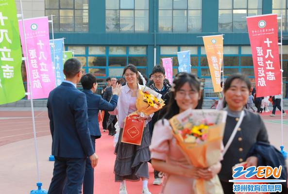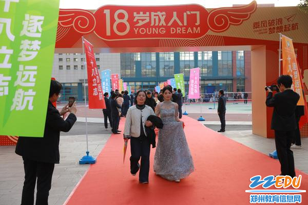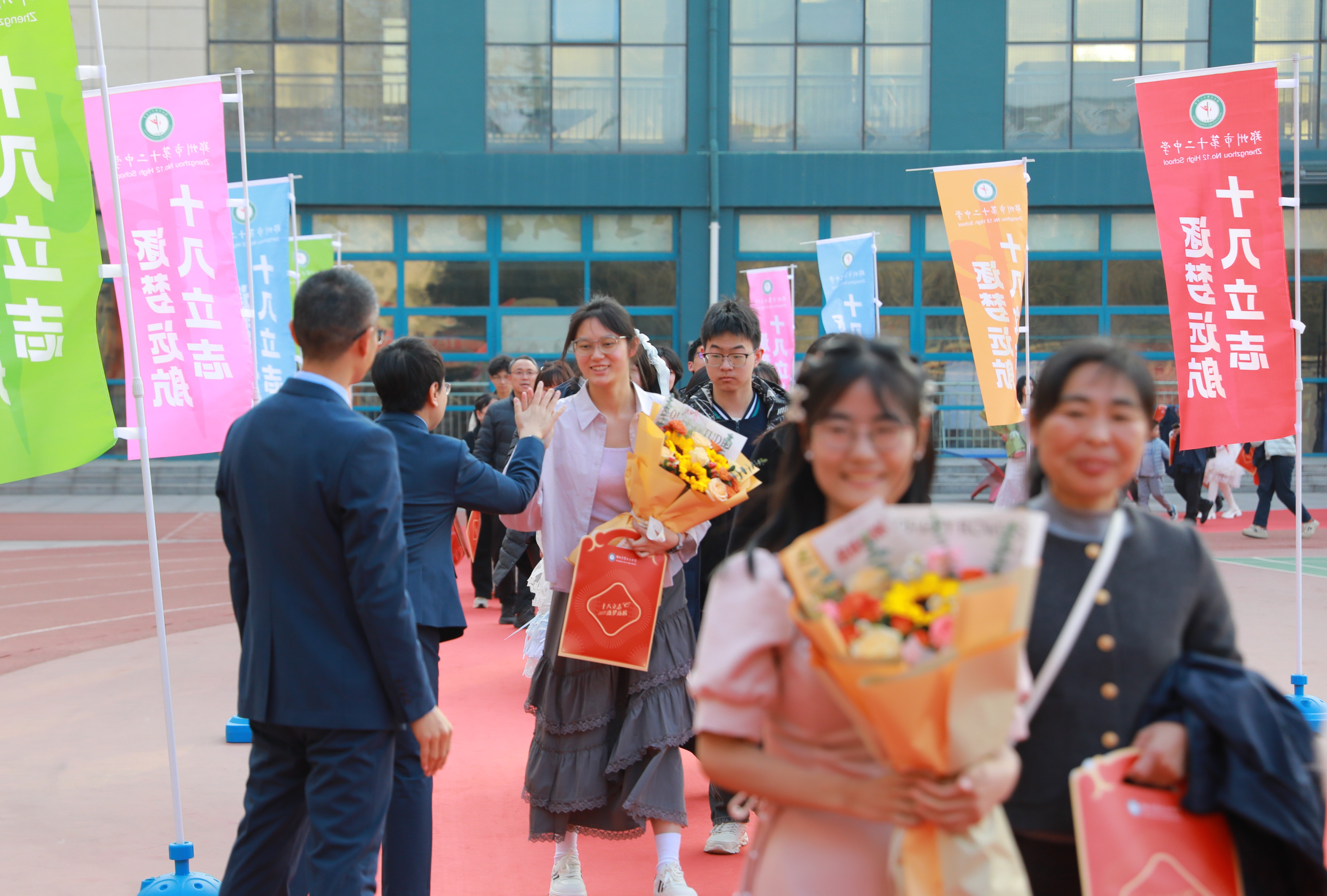 红毯铺陈如练,两侧“十八立志 逐梦远航”旗帜迎风飘扬,高三学子与父母携手同行,身穿礼服,步履坚定,走过成长之路;昂首挺胸,迎接担当之年。他们迎着师长期许的目光如炬,跨过“成人门”,褪去稚气,拾起庄严——少年成人,肩上有风,眼中有光。