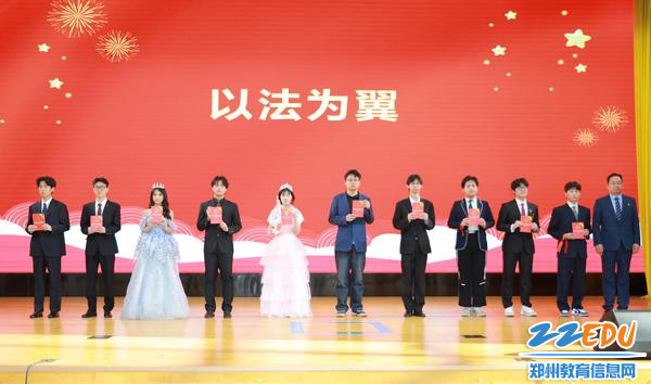 郑州市第十二中学党委副书记、校长周铭为各班学生代表颁发《中华人民共和国宪法》