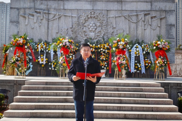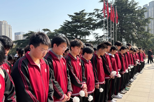 国歌声毕,学校国旗护卫队庄重向革命先烈纪念碑敬献花篮,缎带承载着全体师生的深切哀思。随后全体师生默哀并向英烈三鞠躬,表达崇高敬意。