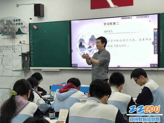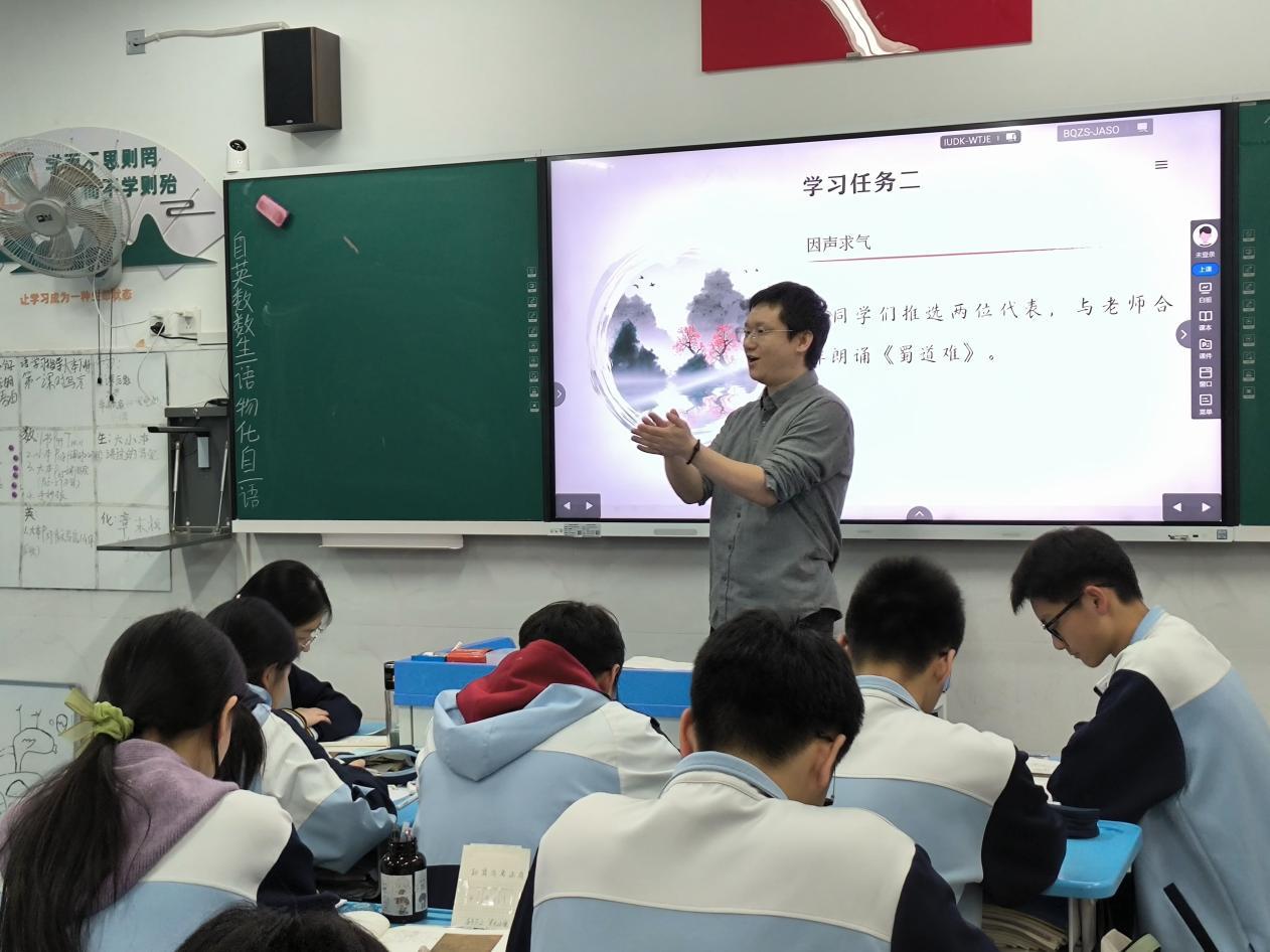 “情动于中而形于言,言之不足故嗟叹之。”在诵读环节,秦老师紧扣杂言古体诗长短错落的特点,与学生们展开师生合作诵读。一唱三叹、快慢结合,学生们在朗朗书声中体悟了豪放飘逸的韵律之美。